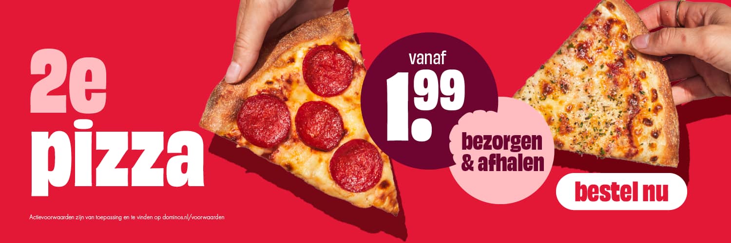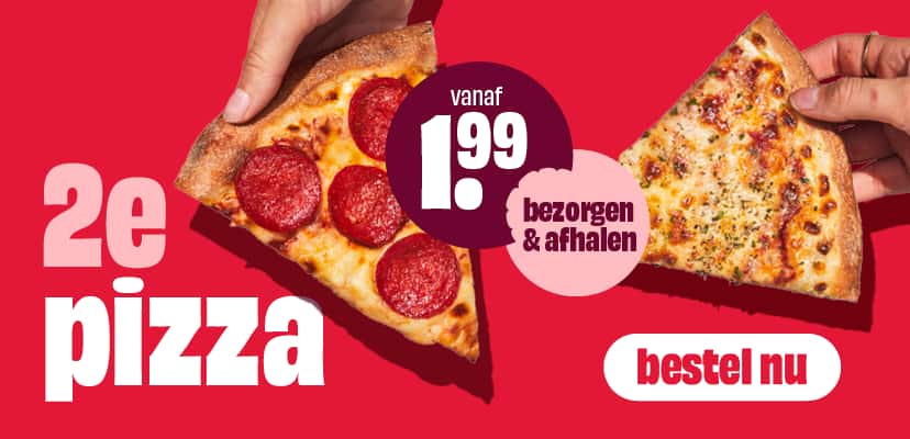 Van 23 februari t/m 8 maart 2026 krijg je de 2e pizza vanaf €1,99! Geldig bij zowel afhalen als bezorgen.